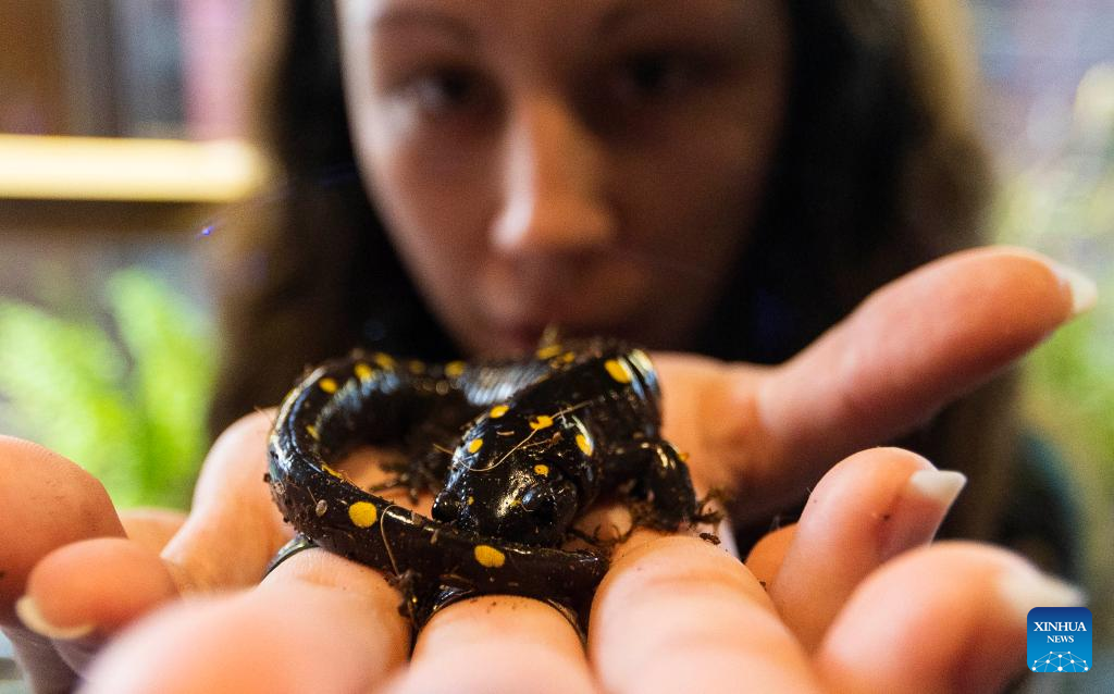 A staff member shows a spotted salamander at Quebec's Biodiversity Museum in Becancour, Canada, Dec. 11, 2022. Founded in 1997, Quebec's Biodiversity Museum is situated in Becancour, 150 km from Montreal, Canada.