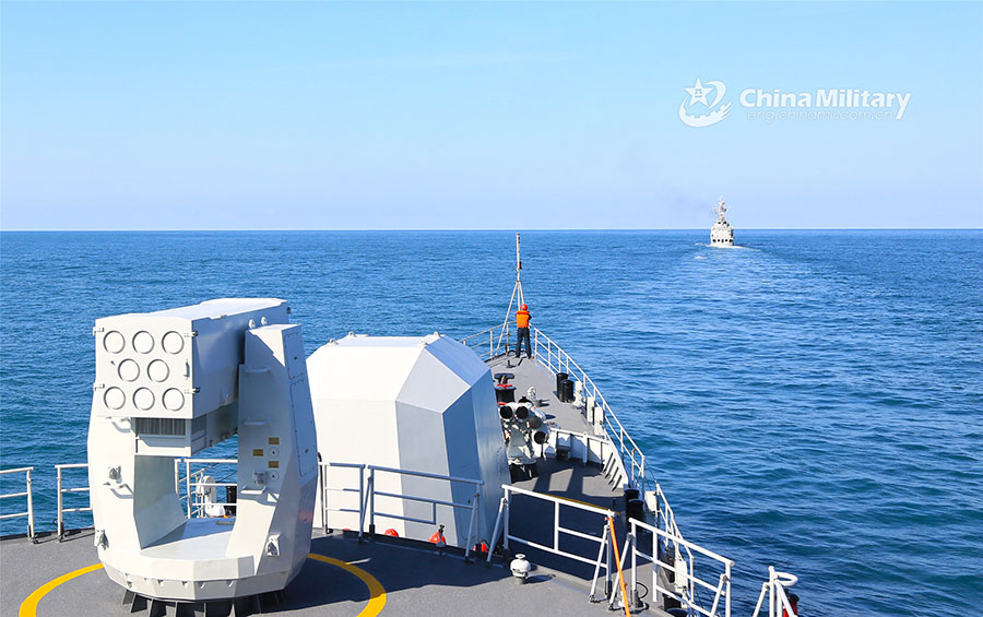 Vessels attached to a frigate flotilla with the navy under the PLA Southern Theater Command steam in formation during a maritime training exercise in late November, 2022. (eng.chinamil.com.cn/Photo by Zhang Weifeng)
