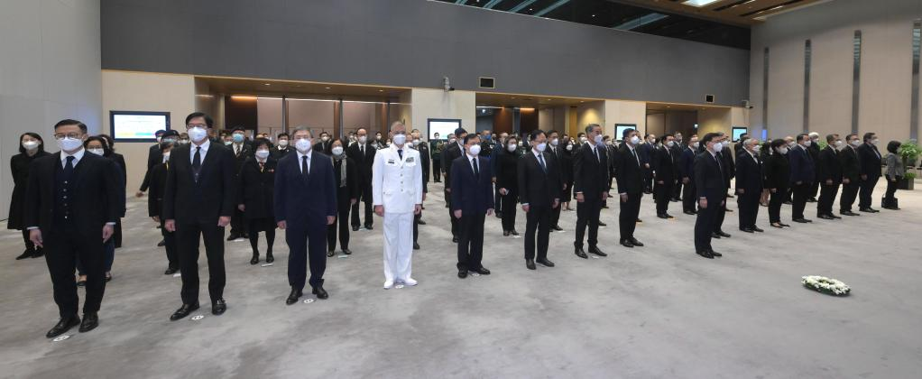 Vice Chairman of the National Committee of the Chinese People's Political Consultative Conference Leung Chun-ying, Chief Executive of the Hong Kong Special Administrative Region (HKSAR) John Lee, and principal officials of the HKSAR government attend a memorial ceremony to mourn the victims of the Nanjing Massacre in Hong Kong, south China, Dec. 13, 2022. (Information Services Department of the Government of the HKSAR/Handout via Xinhua)