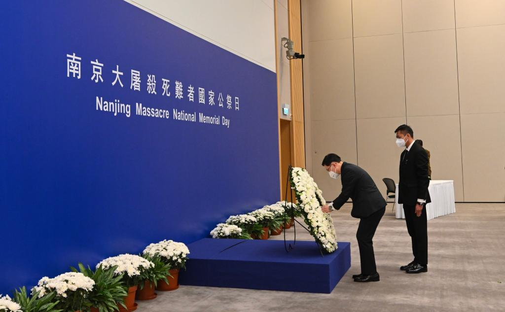 Chief Executive of the Hong Kong Special Administrative Region (HKSAR) John Lee lays a wreath at a memorial ceremony to mourn the victims of the Nanjing Massacre in Hong Kong, south China, Dec. 13, 2022. (Information Services Department of the Government of the HKSAR/Handout via Xinhua)