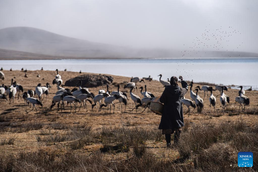 Chen Guanghui feeds black-necked cranes at Yunnan Dashanbao National Nature Reserve for Black-necked Cranes in Zhaotong, southwest China's Yunnan Province, Dec. 10, 2022. Yunnan Dashanbao National Nature Reserve for Black-necked Cranes, located in Zhaoyang District of Zhaotong City, is the most significant wintering habitat and transfer station for migratory black-necked cranes on the Yunnan-Guizhou Plateau.