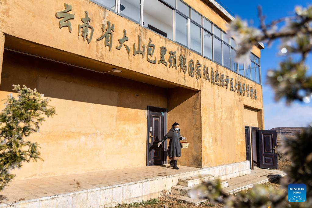 Chen Guanghui prepares to feed black-necked cranes at Yunnan Dashanbao National Nature Reserve for Black-necked Cranes in Zhaotong, southwest China's Yunnan Province, Dec. 10, 2022. Yunnan Dashanbao National Nature Reserve for Black-necked Cranes, located in Zhaoyang District of Zhaotong City, is the most significant wintering habitat and transfer station for migratory black-necked cranes on the Yunnan-Guizhou Plateau.