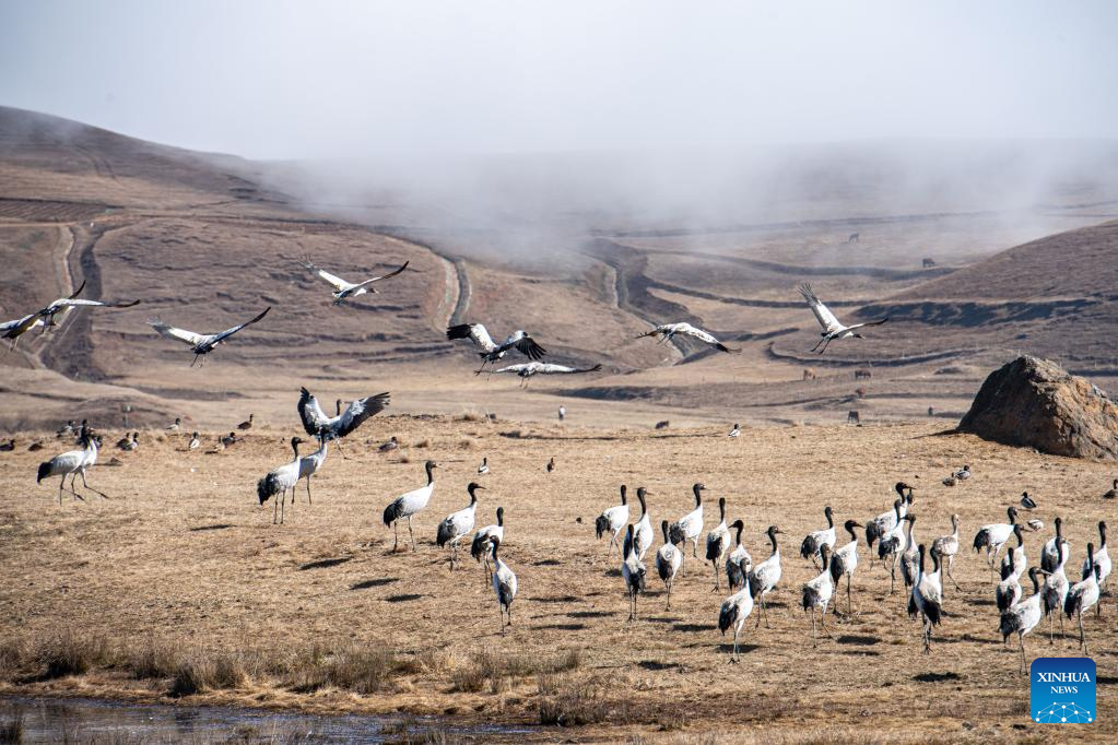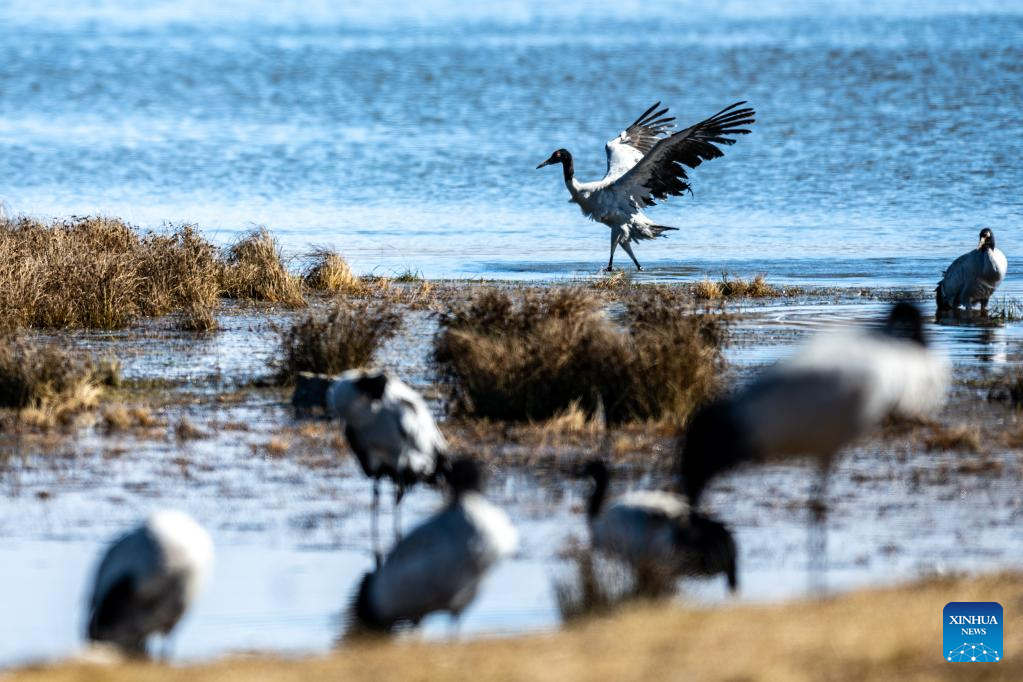 Over recent years, the reserve has made a determined effort to implement conservation measures, such as wetland protection and restoration and construction of food source bases, in order to steadily improve its ecological environment for migratory birds. During the past three years, an average of over 1,500 black-necked cranes were spotted arriving at the reserve for wintering. (Xinhua/Cao Mengyao)