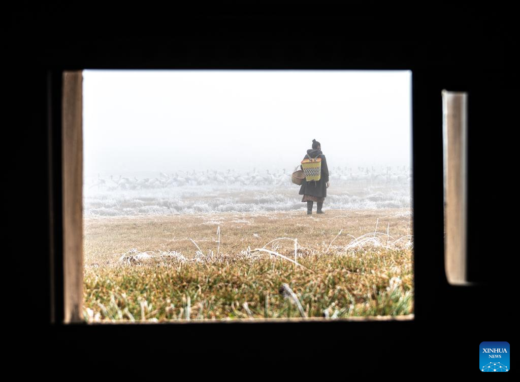 Chen Guanghui prepares to feed black-necked cranes at Yunnan Dashanbao National Nature Reserve for Black-necked Cranes in Zhaotong, southwest China's Yunnan Province, Dec. 11, 2022. Yunnan Dashanbao National Nature Reserve for Black-necked Cranes, located in Zhaoyang District of Zhaotong City, is the most significant wintering habitat and transfer station for migratory black-necked cranes on the Yunnan-Guizhou Plateau.