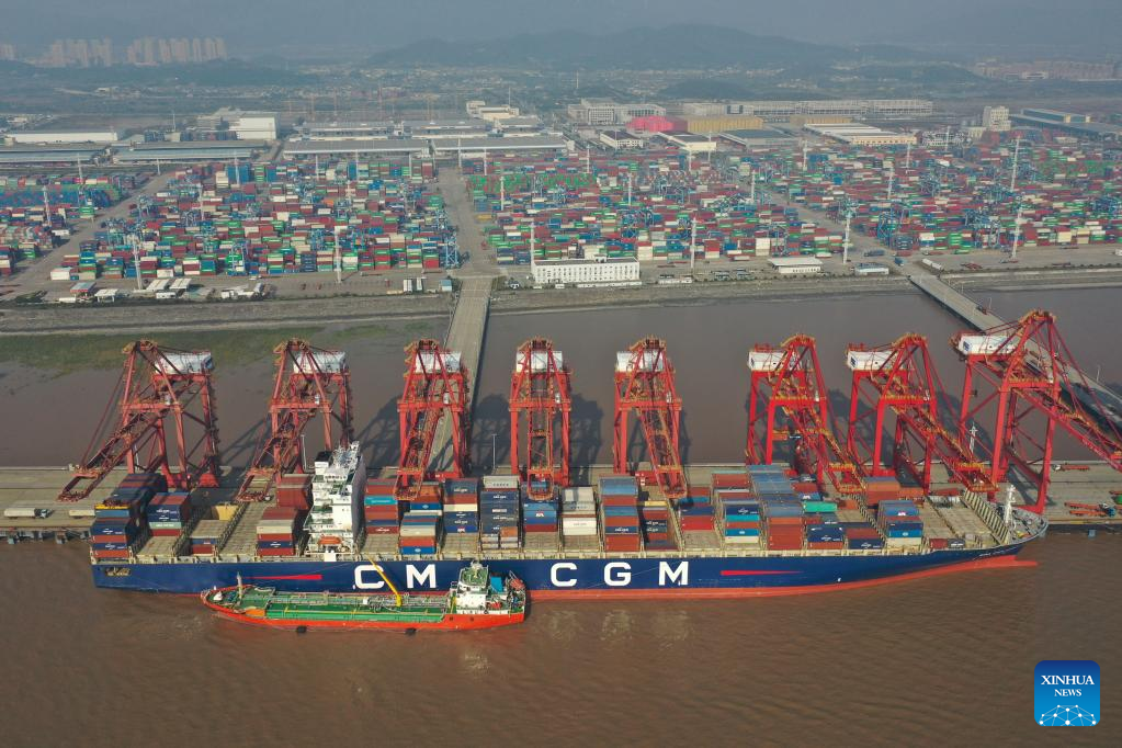This aerial photo taken on Dec. 13, 2022 shows a cargo ship docking at Ningbo-Zhoushan Port in east China's Zhejiang Province. (Xinhua/Huang Zongzhi)