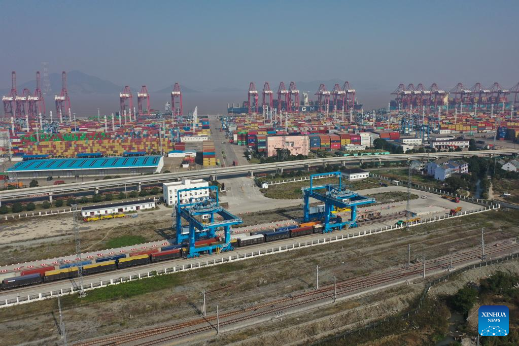 This aerial photo taken on Dec. 13, 2022 shows gantry crane loading and uploading containers of sea-rail intermodal trains at Ningbo-Zhoushan Port in east China's Zhejiang Province. (Xinhua/Huang Zongzhi)