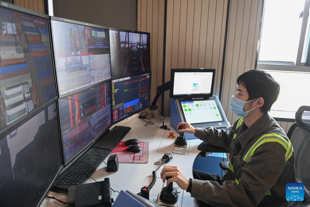 A staff member controls the loading of containers remotely at Ningbo-Zhoushan Port in east China's Zhejiang Province, Dec. 13, 2022. (Xinhua/Huang Zongzhi)