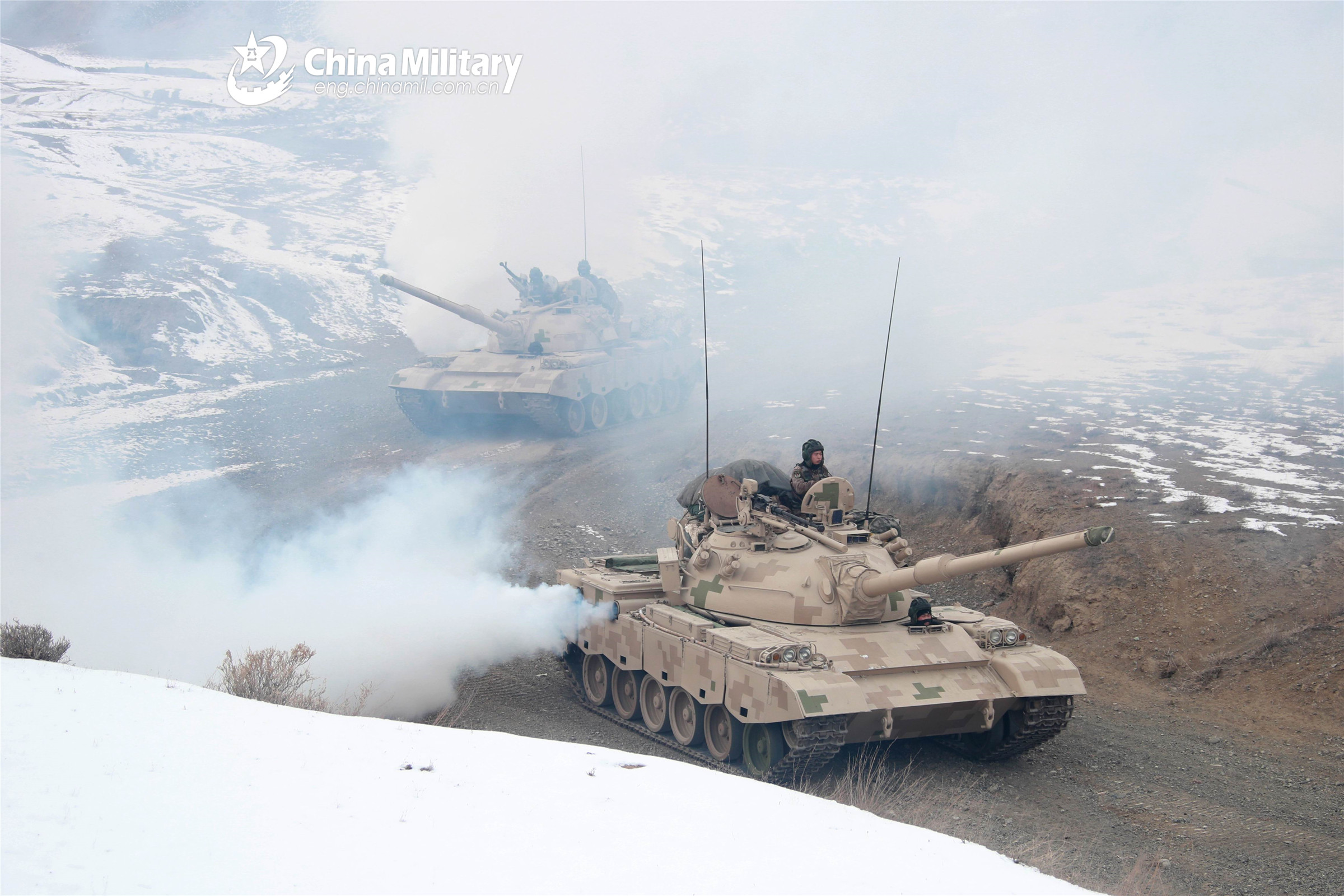 Main battle tanks (MBTs) attached to an armored element of a combined-arms regiment under the PLA Xinjiang Military Command are en route to the training field during a tactical maneuver training exercise on November 30, 2022. (eng.chinamil.com.cn/Photo by Yuan Kai)