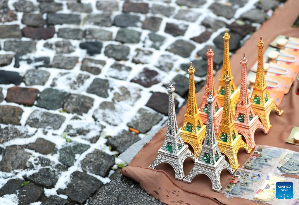 This photo taken on Dec. 14, 2022 shows the Eiffel Tower sculpture souvenirs sold by a street vendor at the Montmartre after snow in Paris, France. (Xinhua/Gao Jing)