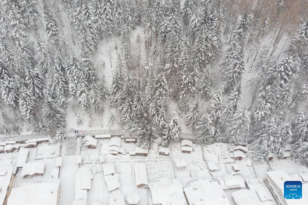 This aerial photo taken on Dec. 14, 2022 shows a view of the Snow Town scenic spot in Hailin City in northeast China's Heilongjiang Province. The Snow Town scenic spot officially opened recently. Enjoying a seven-month snow season, it has become an attraction for tourists for years. (Xinhua/Xie Jianfei)