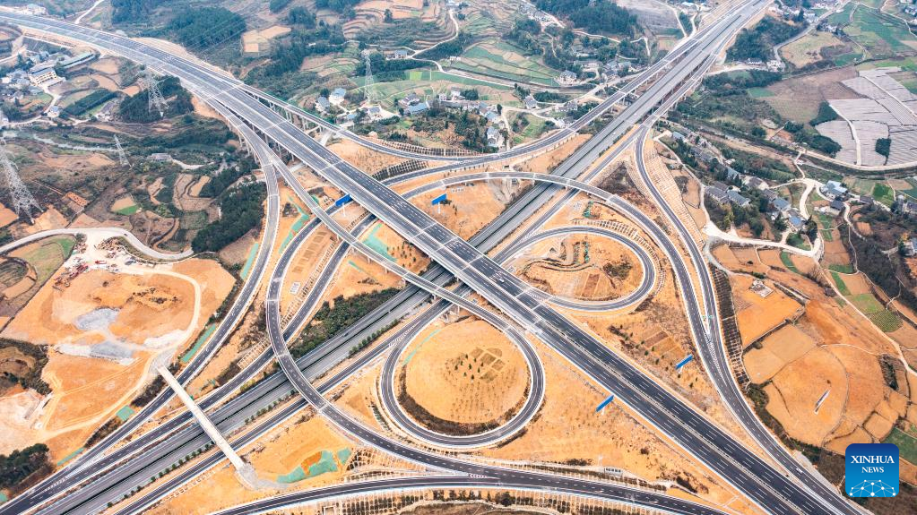This aerial photo taken on Dec. 15, 2022 shows engineering vehicles running on the Lianchi interchange of an expressway linking Renhuai City and Zunyi City in southwest China's Guizhou Province. The Renhuai-Zunyi Expressway was officially put into full operation on Friday. It reduces the road travel time between Renhuai and Zunyi from an hour and a half to 30 minutes. (Xinhua/Tao Liang)