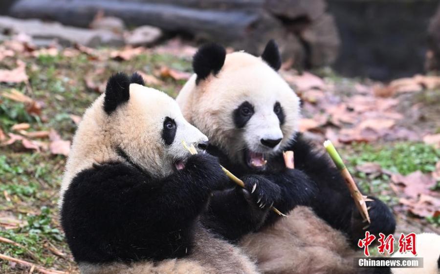 Giant pandas eat bamboo shoots at the Dujiangyan base of the China Conservation and Research Center for Giant Panda, southwest China's Sichuan Province, Dec. 15, 2022. (Photo: China News Service/An Yuan)