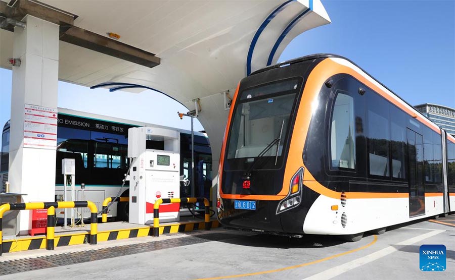 A hydrogen fuel cell-powered public bus is refueled at a hydrogen refueling station in Lingang new area of Pudong New Area in east China's Shanghai, Dec. 15, 2022. As a demonstrative zone for commercial operation of hydrogen fuel cell-powered vehicles in Shanghai, Lingang new area has walked an extra mile since early 2022 to put more hydrogen fuel cell-powered public buses into practical service and to date 66 units of its kind are now running on the roads there. Another 52 units have already started zero-payload trial operation and are expected to kick off their official service before the end of this year. (Xinhua/Fang Zhe)