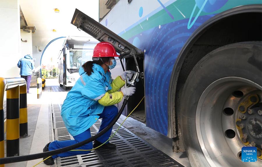 A staff member refuels a public bus at a hydrogen refueling station in Lingang new area of Pudong New Area in east China's Shanghai, Dec. 15, 2022. As a demonstrative zone for commercial operation of hydrogen fuel cell-powered vehicles in Shanghai, Lingang new area has walked an extra mile since early 2022 to put more hydrogen fuel cell-powered public buses into practical service and to date 66 units of its kind are now running on the roads there. Another 52 units have already started zero-payload trial operation and are expected to kick off their official service before the end of this year. (Xinhua/Fang Zhe)