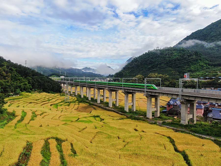 A bullet train runs on the China-Laos Railway in Mengla county, southwest China's Yunnan province, September 2022. (Photo by Li Yunsheng/People's Daily Online)