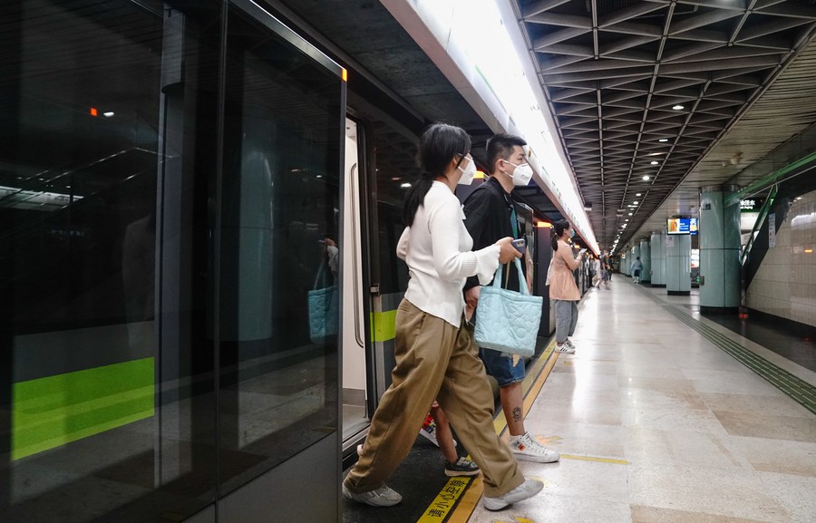 Passengers get off a subway train at East Nanjing Road Station in east China's Shanghai, June 1, 2022. (Xinhua/Ding Ting)