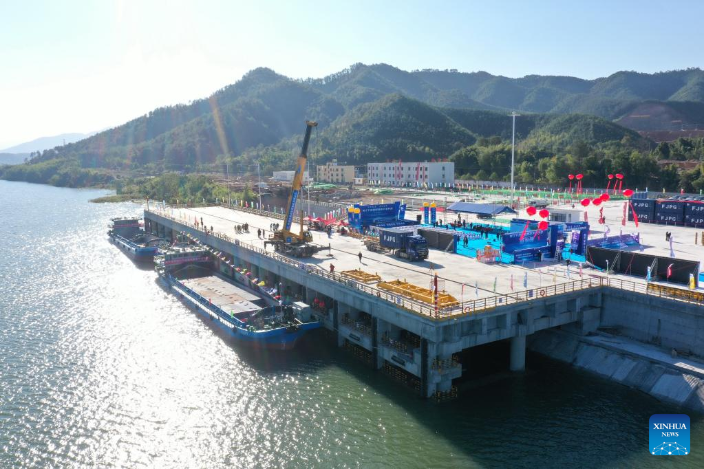 This aerial photo shows containers being loaded onto a new energy cargo ship at a wharf of Nanping Port in southeast China's Fujian Province on Dec. 18, 2022. (Xinhua/Lin Shanchuan)