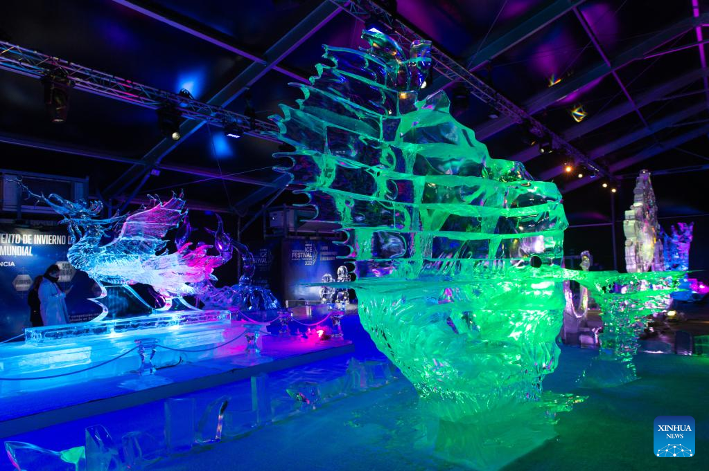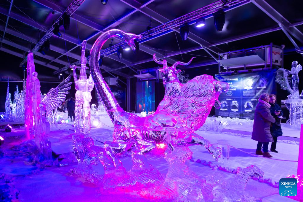 Visitors enjoy the ice sculptures on display at the Ice Festival in Torrejon de Ardoz, Madrid, Spain, on Dec. 15, 2022. (Photo by Gustavo Valiente/Xinhua)