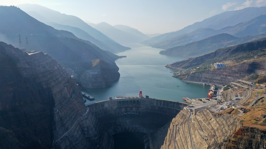 This aerial photo taken on Nov. 25, 2022 shows the Wudongde hydropower station on the border of Sichuan and Yunnan provinces in southwest China. (Xinhua/Xu Bingjie)