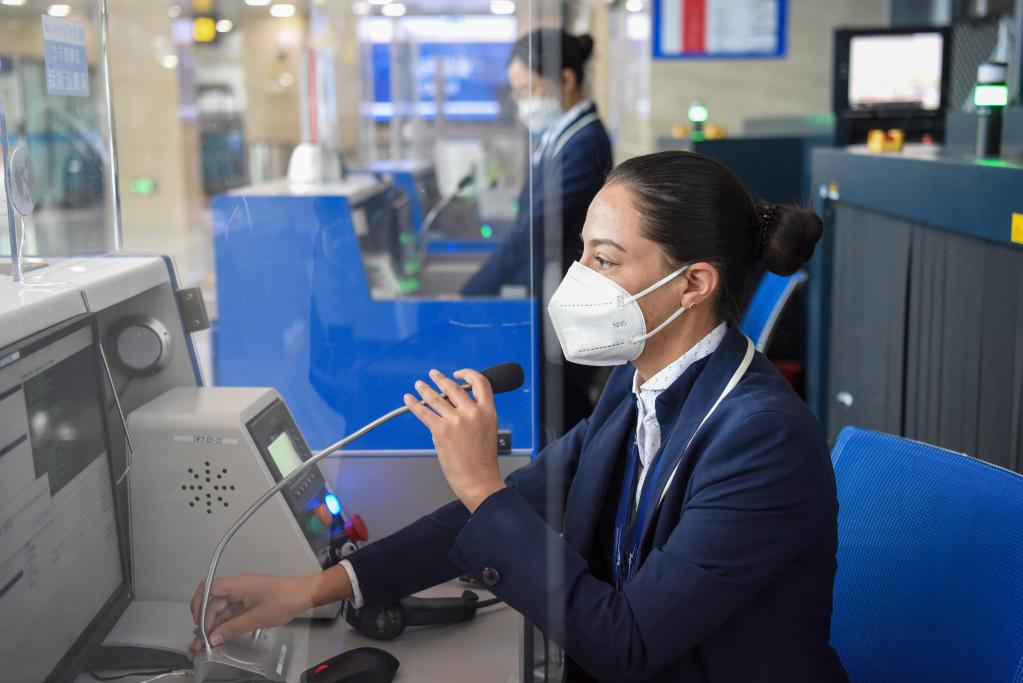 Staff members conduct communication test at the control tower of a new super-high plateau airport in Taxkorgan Tajik Autonomous County, northwest China's Xinjiang Uygur Autonomous Region, Dec. 19, 2022. (Xinhua/Ding Lei)
