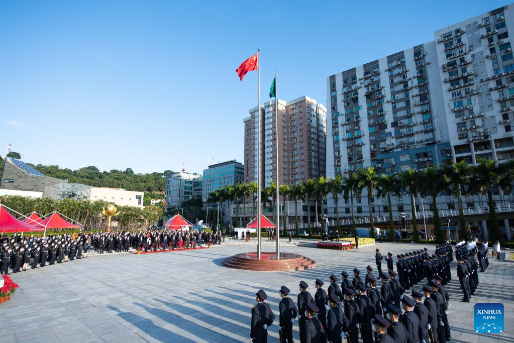 A flag-raising ceremony marking the 23rd anniversary of Macao's return to the motherland is held at the Golden Lotus Square in Macao, south China, Dec. 20, 2022. (Xinhua/Cheong Kam Ka)