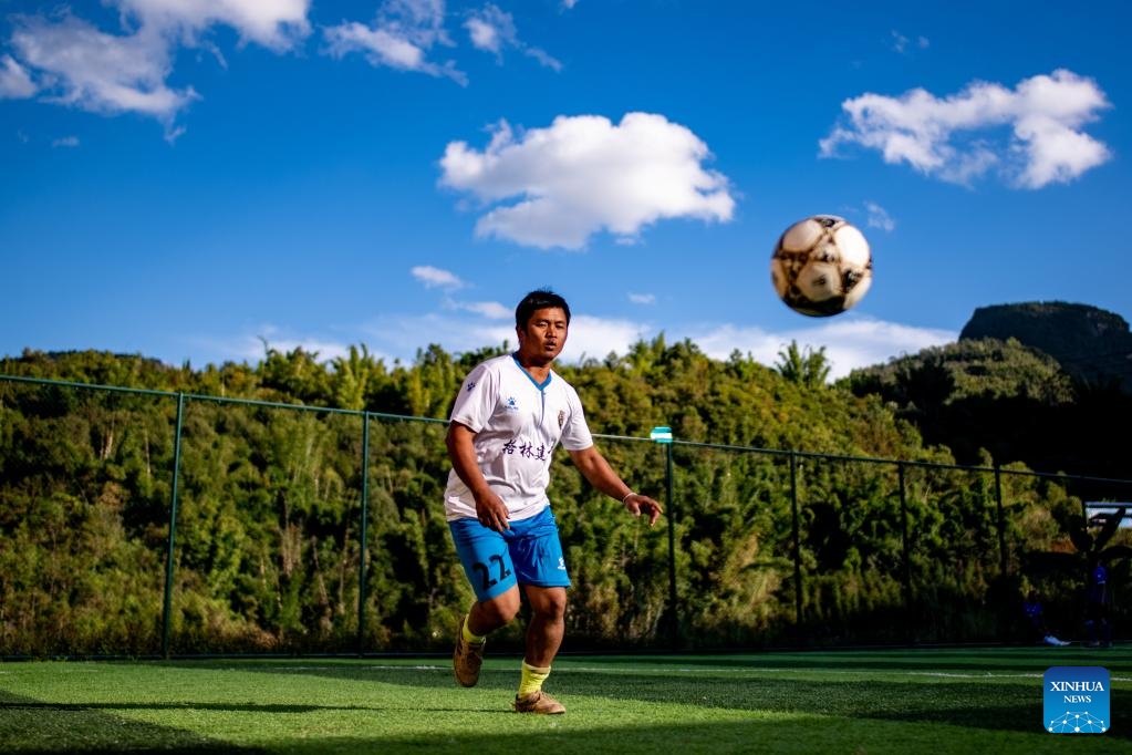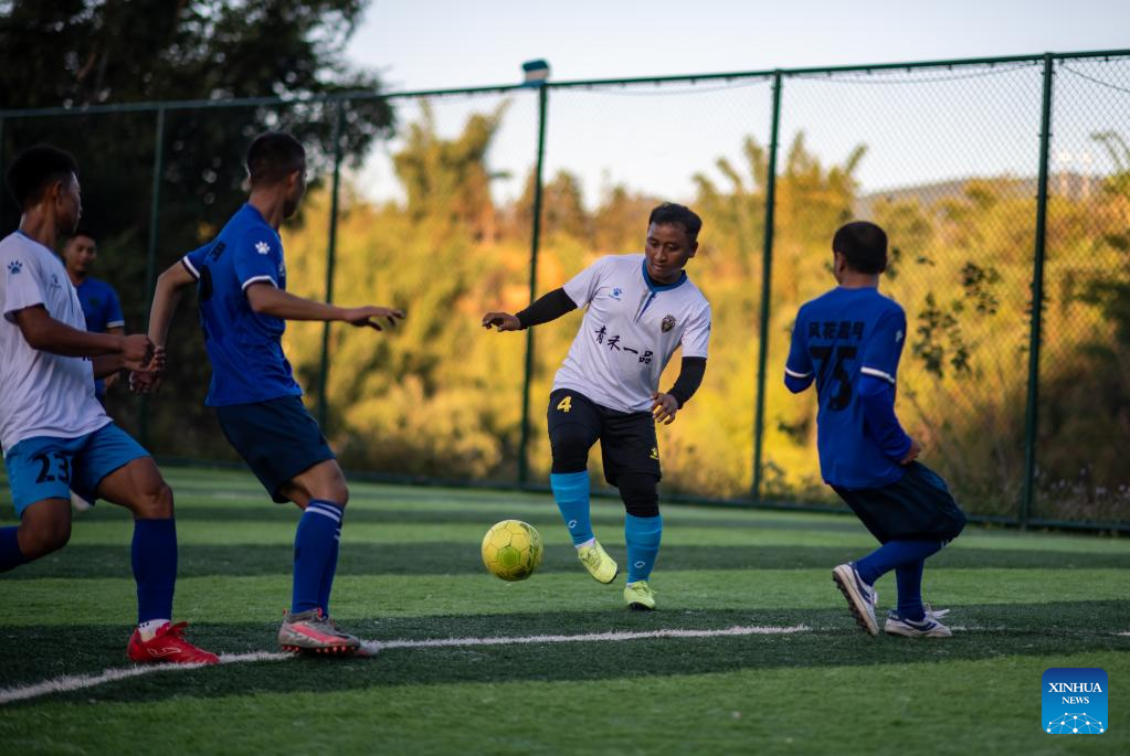 Bao Aigai (2nd R), current captain of the football team of Longnai Village, is seen in a match in Cangyuan Wa Autonomous County of southwest China's Yunnan Province, Dec. 7, 2022. (Xinhua/Jiang Wenyao)