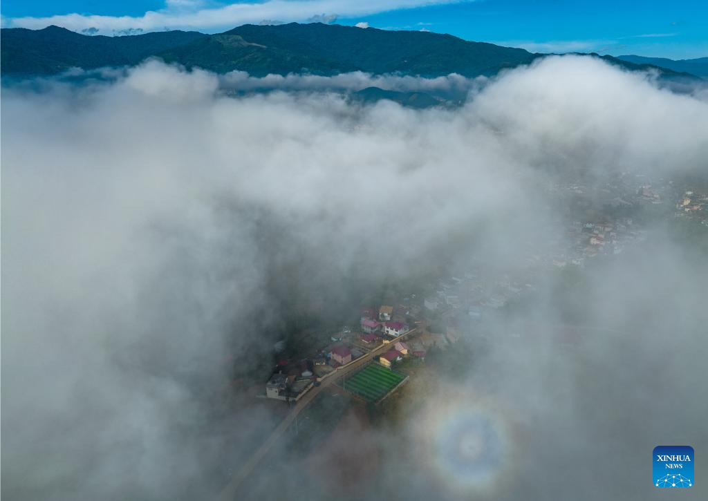 This aerial photo taken on Dec. 8, 2022 shows the futsal pitch of Longnai Village in clouds in Cangyuan Wa Autonomous County of southwest China's Yunnan Province. (Xinhua/Jiang Wenyao)