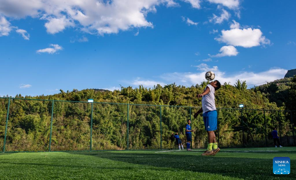 Bao Zhikun, the first captain of the football team of Longnai Village, warms up on the futsal pitch in Longnai Village, Cangyuan Wa Autonomous County of southwest China's Yunnan Province, Dec. 7, 2022. (Xinhua/Jiang Wenyao)