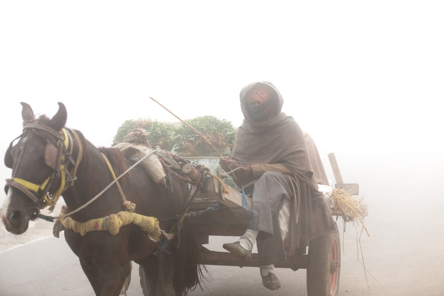 A vegetable vendor rides his horse cart amid heavy fog on a cold morning in Amritsar district of India's northern Punjab state, December 19, 2022. (str/xinhua)