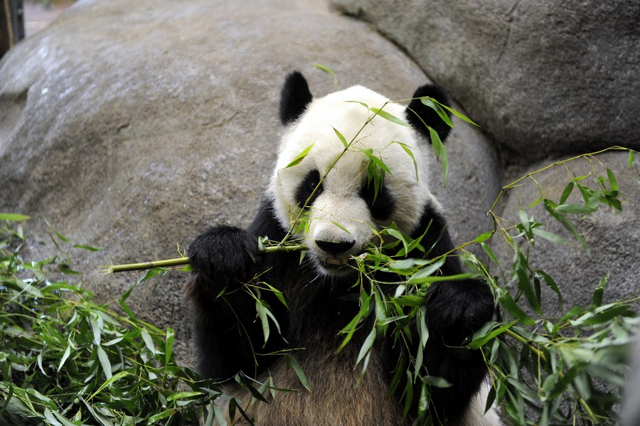 Chinese giant panda Le Le eats bamboo leaves in its enclosure at the Memphis Zoo in Memphis, Tennessee, the United States, Aug. 13, 2010. (Xinhua/Jiang Guopeng)