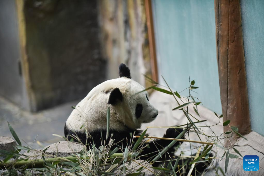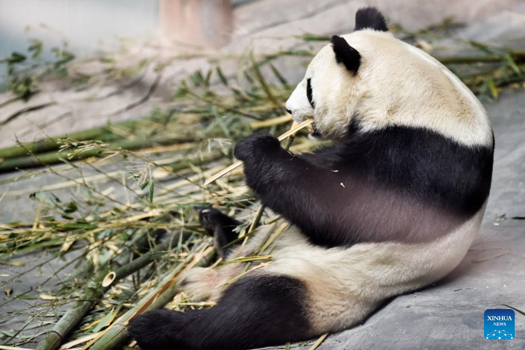A giant panda eats bamboo at Xining Panda House in Xining, capital city of northwest China's Qinghai Province, Dec. 22, 2022. (Xinhua/Wu Gang)