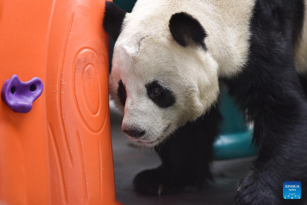 A giant panda plays at Xining Panda House in Xining, capital city of northwest China's Qinghai Province, Dec. 22, 2022. (Xinhua/Wu Gang)