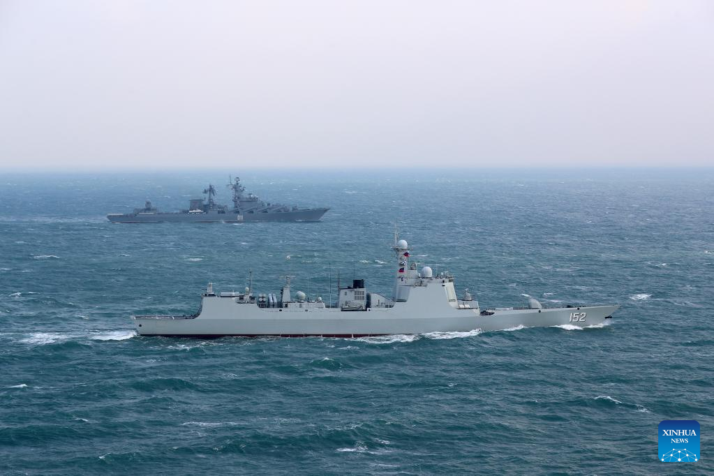 Destroyer Jinan of Chinese navy (front) and cruiser Varyag of Russian navy are seen during a joint naval exercise, Joint Sea 2022, in the East China Sea on Dec. 21, 2022. (Photo by Xu Wei/Xinhua)