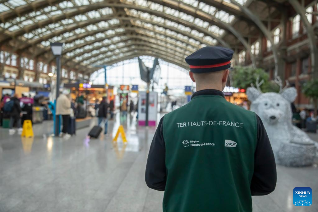 A conductor talks with passengers on a platform at Gare Lille Flandres in Lille, northern France, on Dec. 23, 2022. (Photo by Sebastien Courdji/Xinhua)