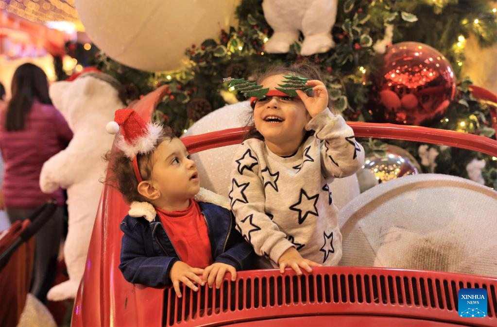 Children have fun in a small car at a Christmas market in Beirut, Lebanon, on Dec. 23, 2022. (Xinhua/Liu Zongya)