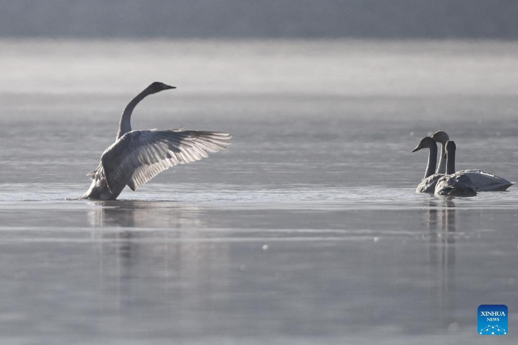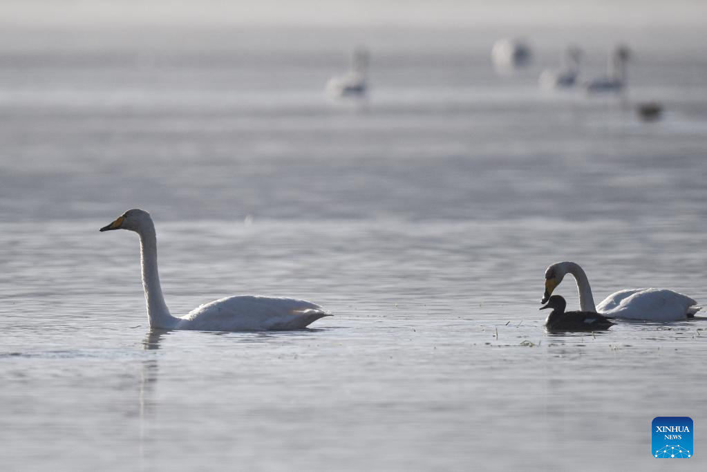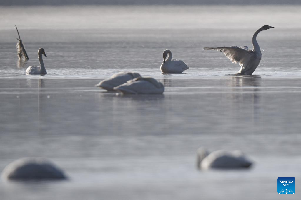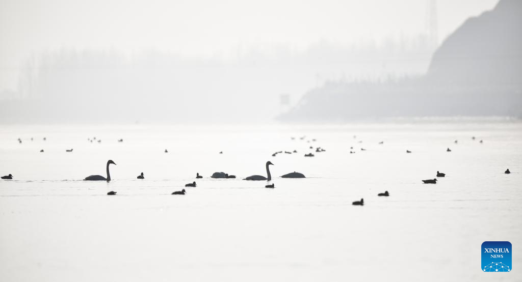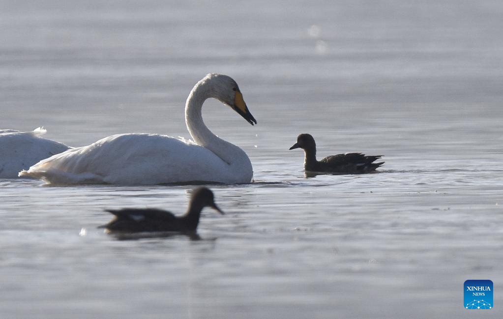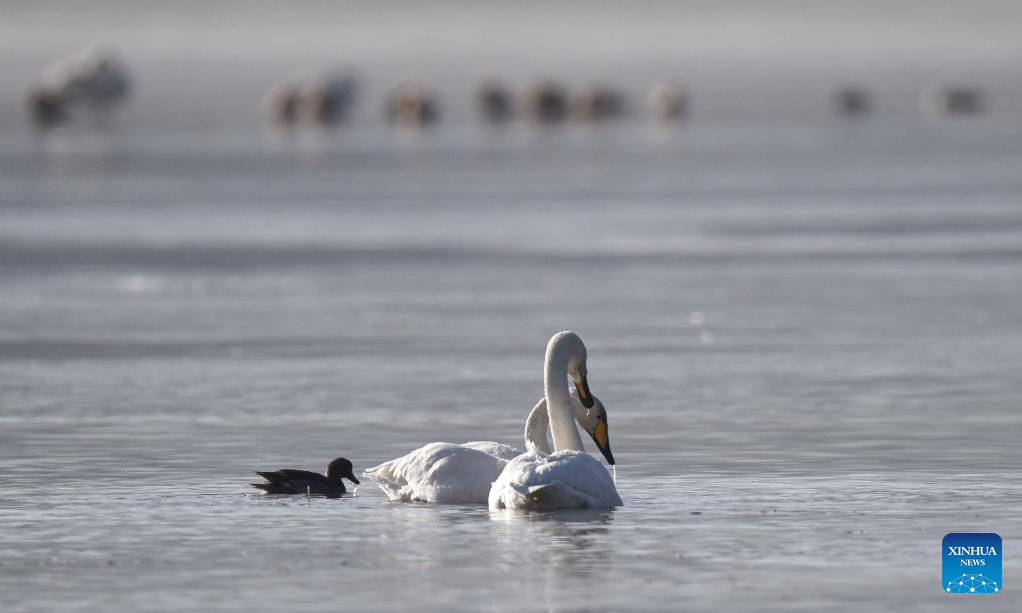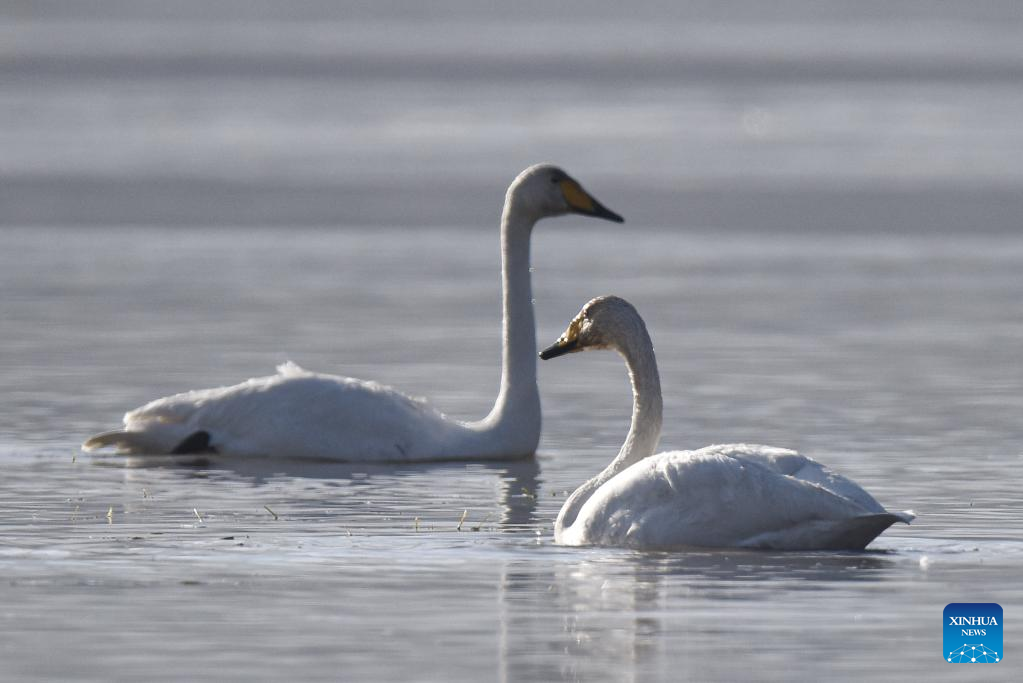 Wintering whooper swans are seen at the Yellow River in Hualong Hui Autonomous County of Haidong City, northwest China's Qinghai Province, Dec. 23, 2022. (Xinhua/Wu Gang)
