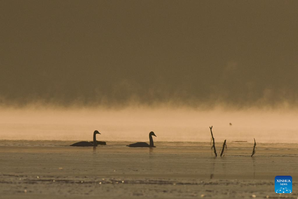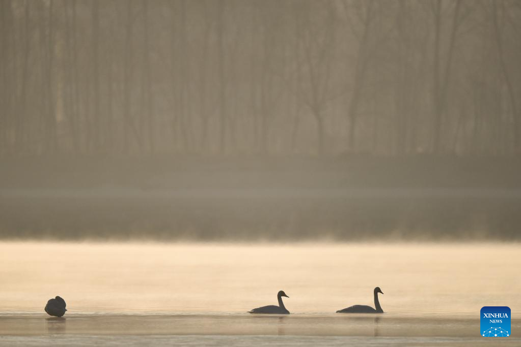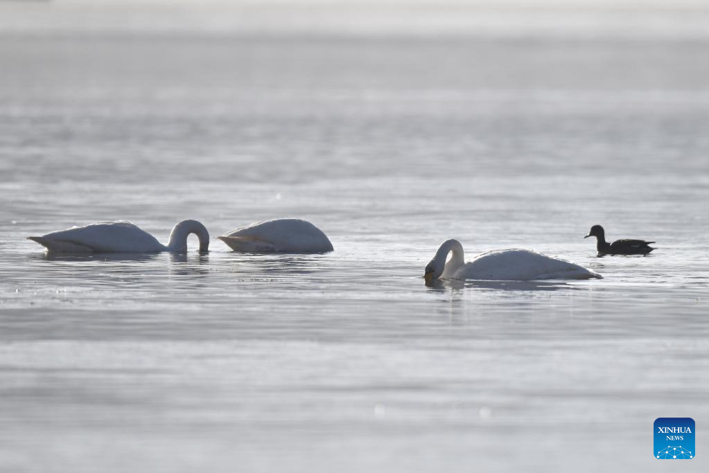 Wintering whooper swans seen at Yellow River in NW China's Qinghai