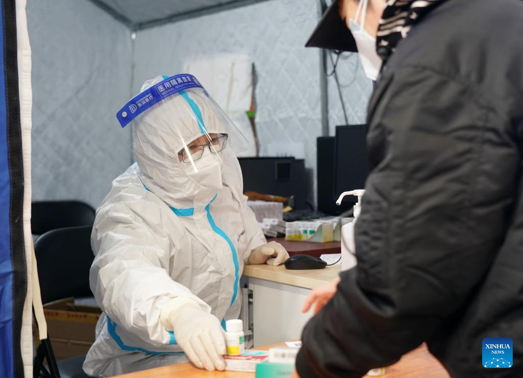 A medical worker passes medicine to a citizen in a makeshift fever clinic in Guang'an Gymnasium in Beijing, capital of China, Dec. 24, 2022. (Xinhua/Zhang Chenlin)