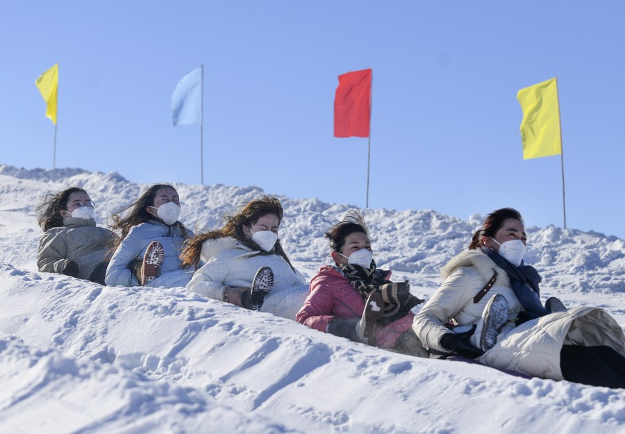 People participate in snow entertainment at a ski resort in Kazak Autonomous County of Mori, northwest China's Xinjiang Uygur Autonomous Region, Dec. 12, 2022. (Xinhua/Wang Fei)