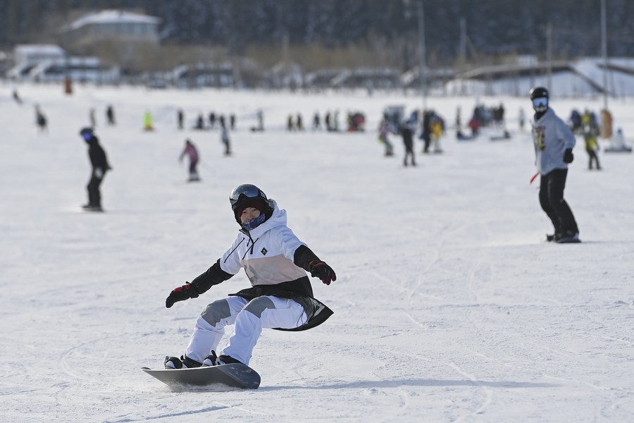 People snowboard at a ski resort in Urumqi, northwest China's Xinjiang Uygur Autonomous Region, Dec. 5, 2022. (Xinhua/Ding Lei)