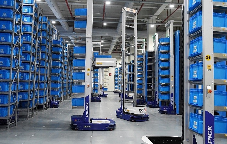 Automated devices, including 4-way shuttle movers and automated guided vehicles, work in a warehouse of an international logistics center in Haikou Integrated Free Trade Zone, south China's Hainan province, November 2022. (People's Daily Online/Zhang Junqi)