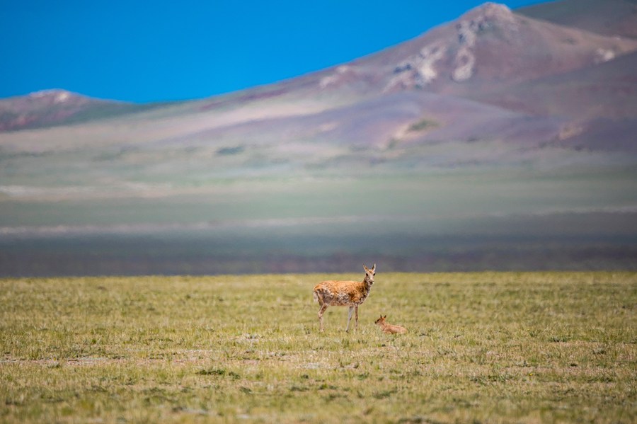 Photo taken on July 11, 2022 shows a female Tibetan antelope taking care of its baby at the Qiangtang National Nature Reserve in southwest China's Tibet autonomous region. [Photo/Xinhua]