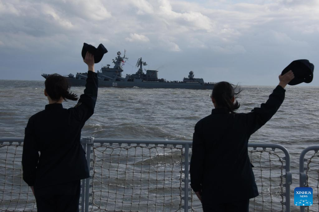 Sailors on board Chinese naval destroyer Jinan wave goodbye to a warship from Russian navy after a joint naval exercise, Joint Sea 2022, in the East China Sea on Dec. 27, 2022. (Xinhua/Li Yun)