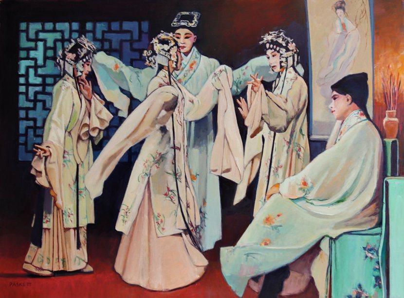David Paskett: Through the painting of The Peony Pavilion, I’ve had to really try to get a bit of understanding of what the story is about; what is underneath it, and the way that it is about freedom of living a free life based on one’s heart, compared with living a sort of structured, Confucian, ordered sort of life. When I started painting, I wasn’t so aware of that. I was showing the interaction and the love scenes, the sort of interaction between people. But gradually, through doing the painting, I’ve realised there are a lot of layers in it, and that has made this series of paintings which isn’t finished yet, and I’m changing my ideas as I go along.