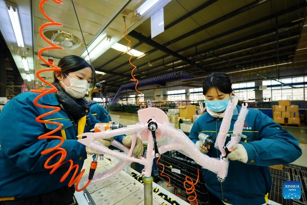 Workers are seen busy on the production line at a factory of a bicycle and baby stroller manufacturer in Pingxiang County, north China's Hebei Province, Dec. 27, 2022. (Xinhua/Mu Yu)