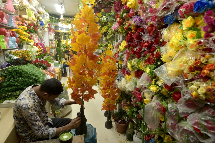 A vendor arranges artificial flowers imported from China at a shop in Dhaka, Bangladesh, Dec. 11, 2022. (Xinhua)