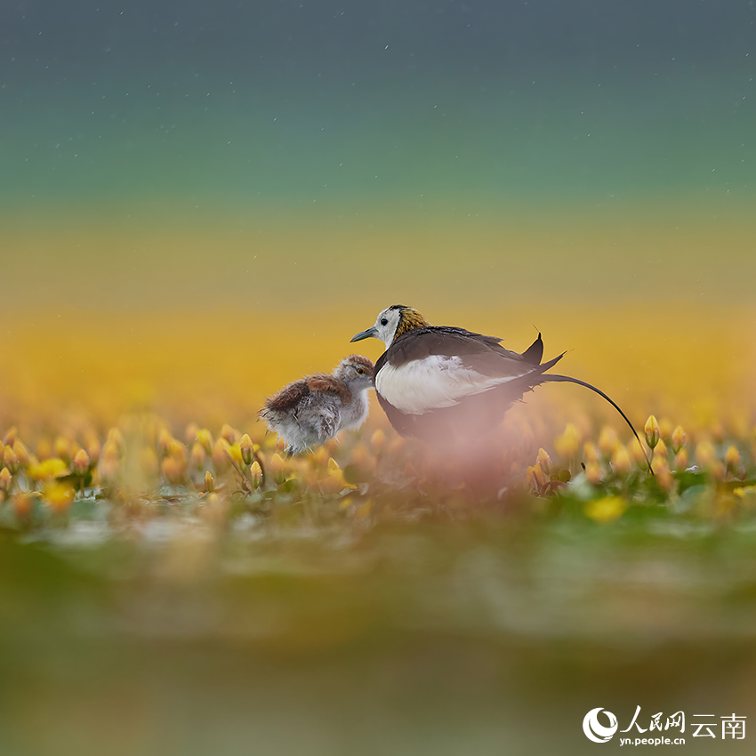 Pheasant-tailed jacana chicks and adults forage in the Qinghuahai National Wetland Park in Baoshan city, southwest China’s Yunnan Province, September 2022. The pheasant-tailed jacana is under national second-class protection in China. (Photo/Ma Yun)