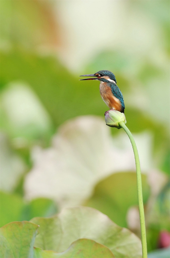 A bird perches on a lotus flower in a pond in Tengchong city, southwest China’s Yunnan Province, August 2022. (Photo/Zhu Yuan)