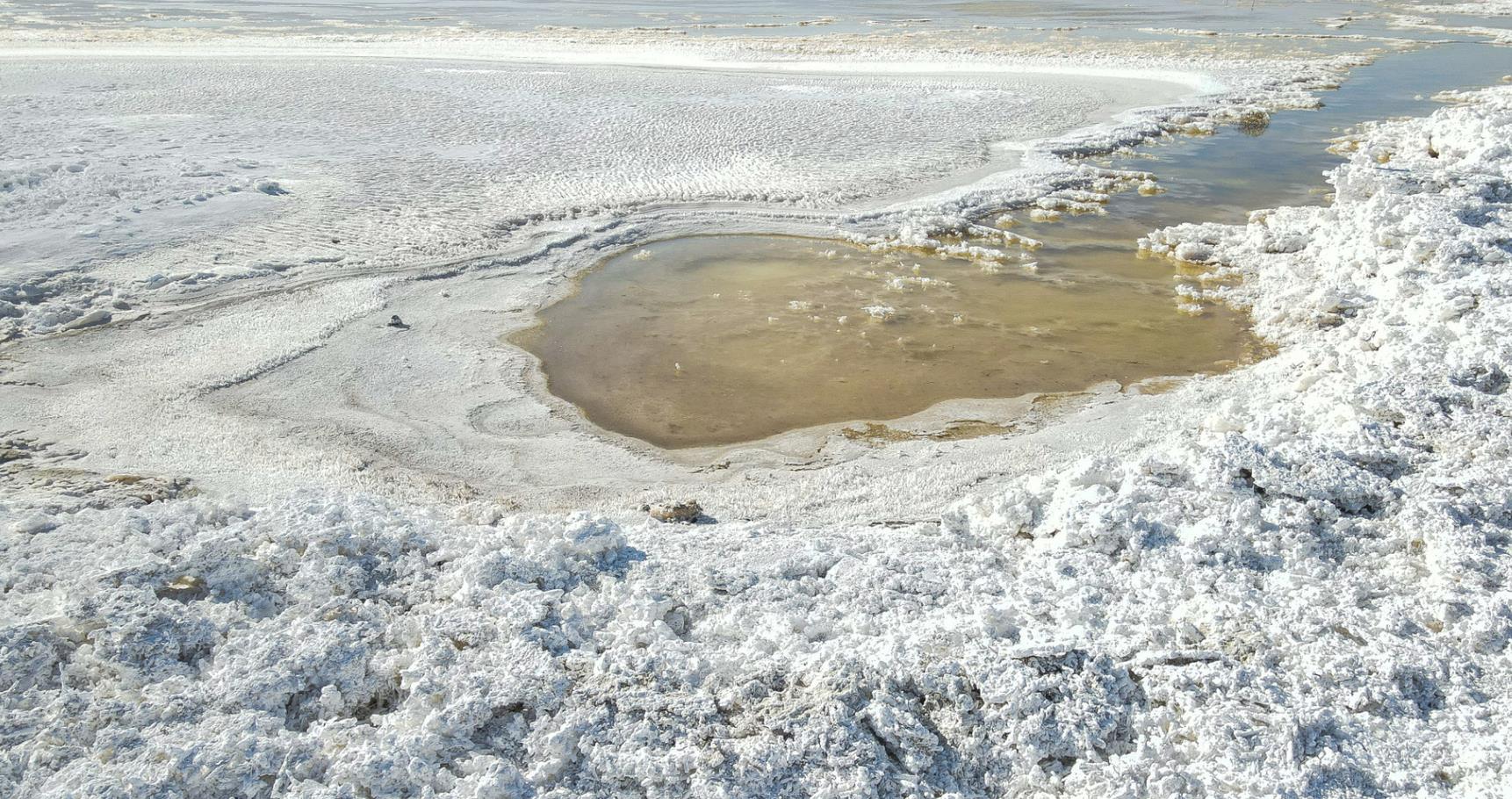 “Crystal flowers”, crystallized from sodium sulfate and magnesium sulfate in cold weather, appear on the surface of a salt lake in Yuncheng, north China’s Shanxi Province. (Photo/People’s Daily Online)
