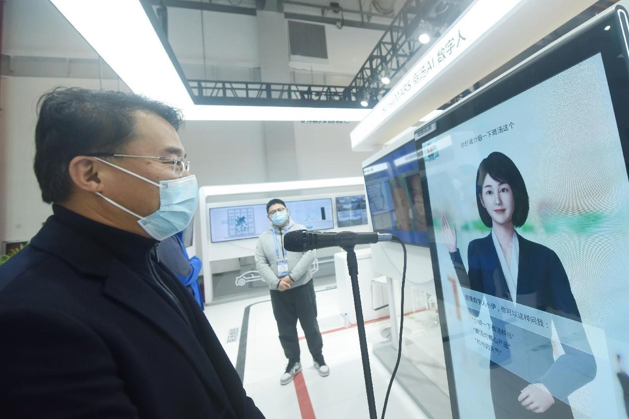 A visitor talks with an artificial intelligence-enabled virtual figure at the first Global Digital Trade Expo held in Hangzhou, east China's Zhejiang province, Dec. 12, 2022. (People's Daily Online/Long Wei)